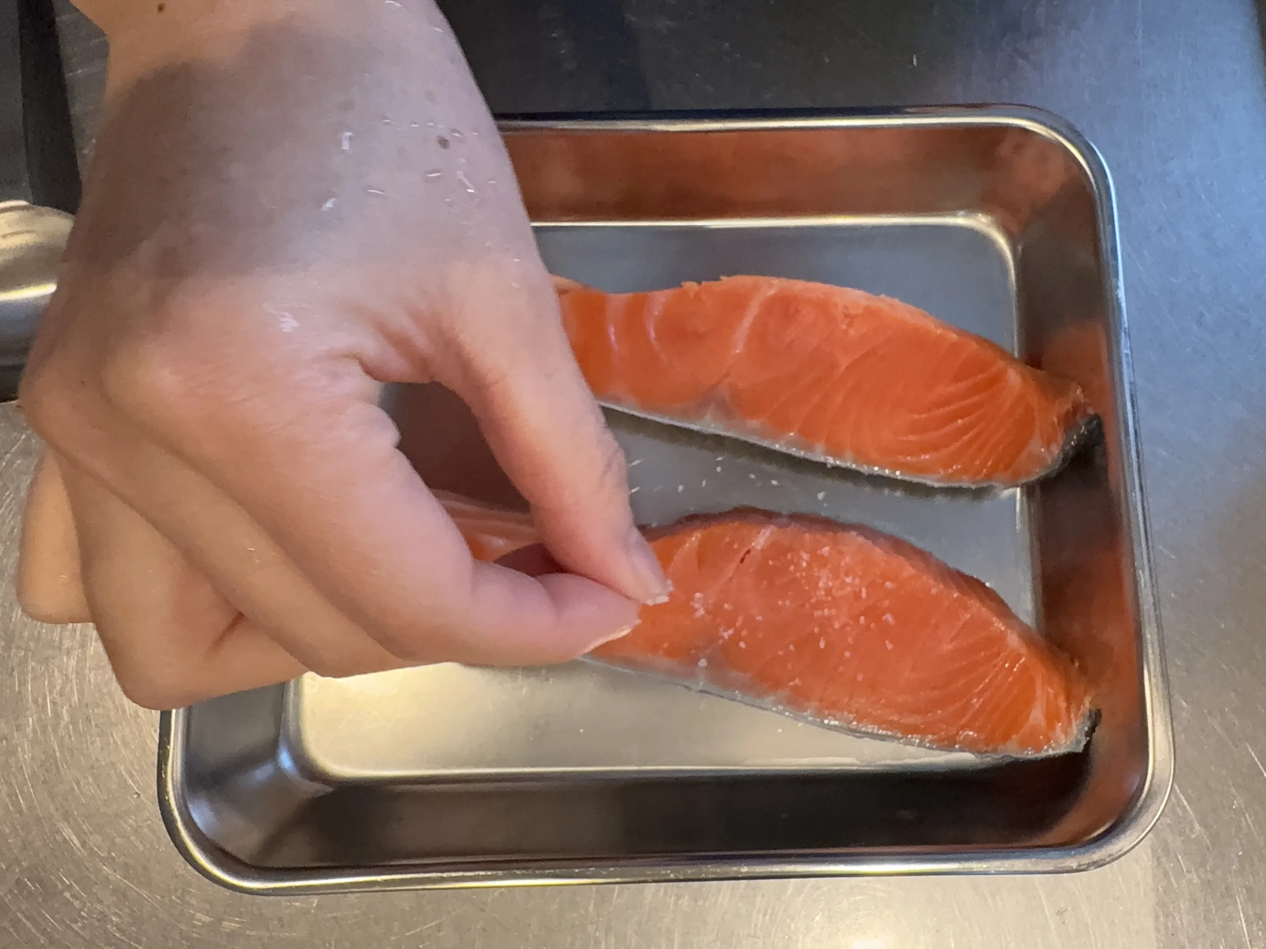 Sprinkle salt over the salmon and let it rest for 10 minutes to remove fishy smells and help absorb the flavors. Pat dry any moisture that appears.