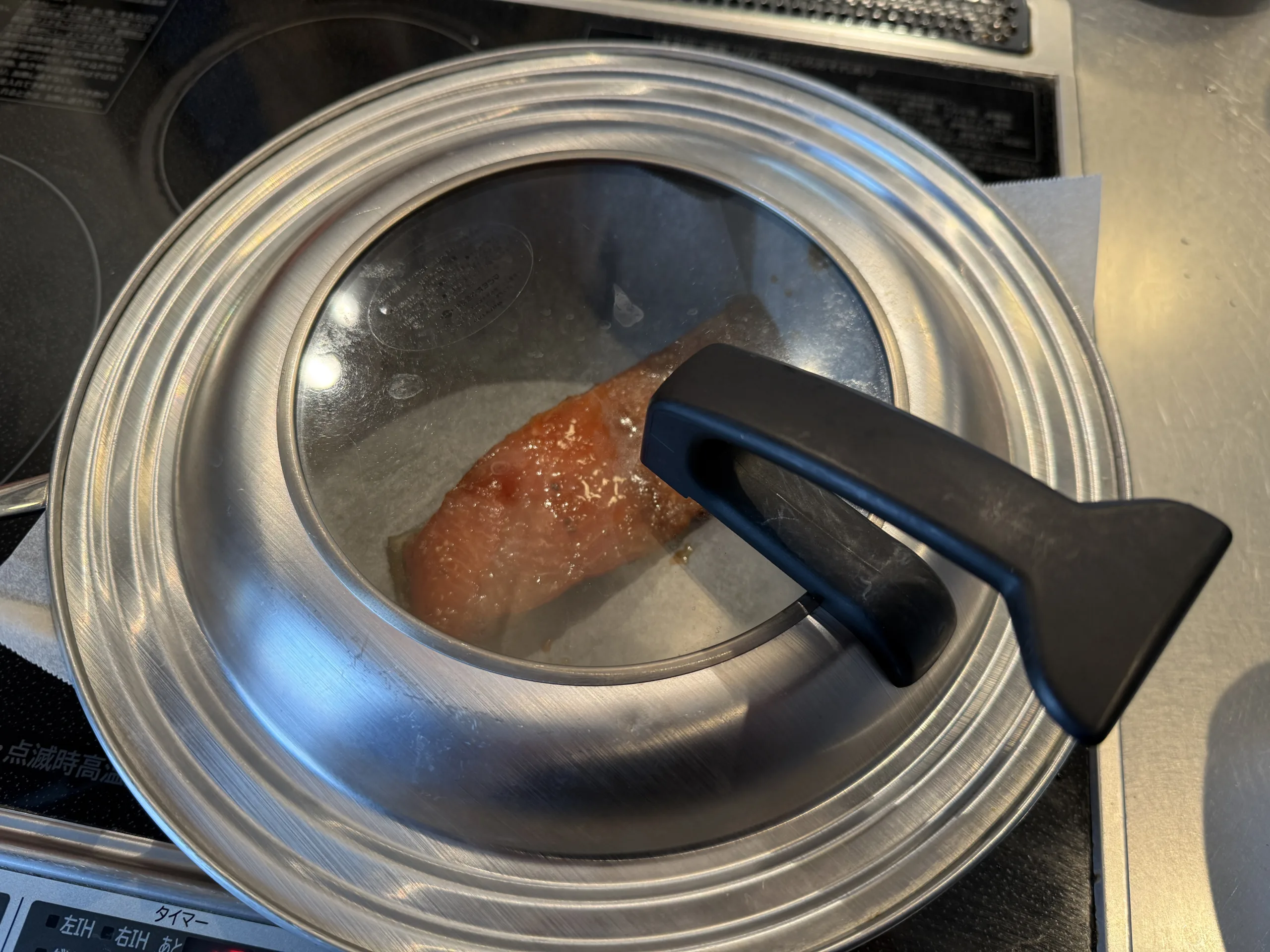Line a non-stick frying pan with parchment paper and place the miso-marinated salmon filets on top. If the salmon filet is thick, placing it skin-side down will allow the skin to crisp and add a delicious, savory flavor. For thinner filets, it’s fine if the skin isn’t facing down, it will still cook well. Cover with a lid and cook over low heat for about 15 minutes. Since miso burns easily, it’s important to keep the heat low. The lid traps the moisture released from the salmon, gently steaming it as it cooks. Cooking time will vary depending on the thickness of the filets, but as a general rule, the salmon is ready when the surface turns a pale pinkish-white.