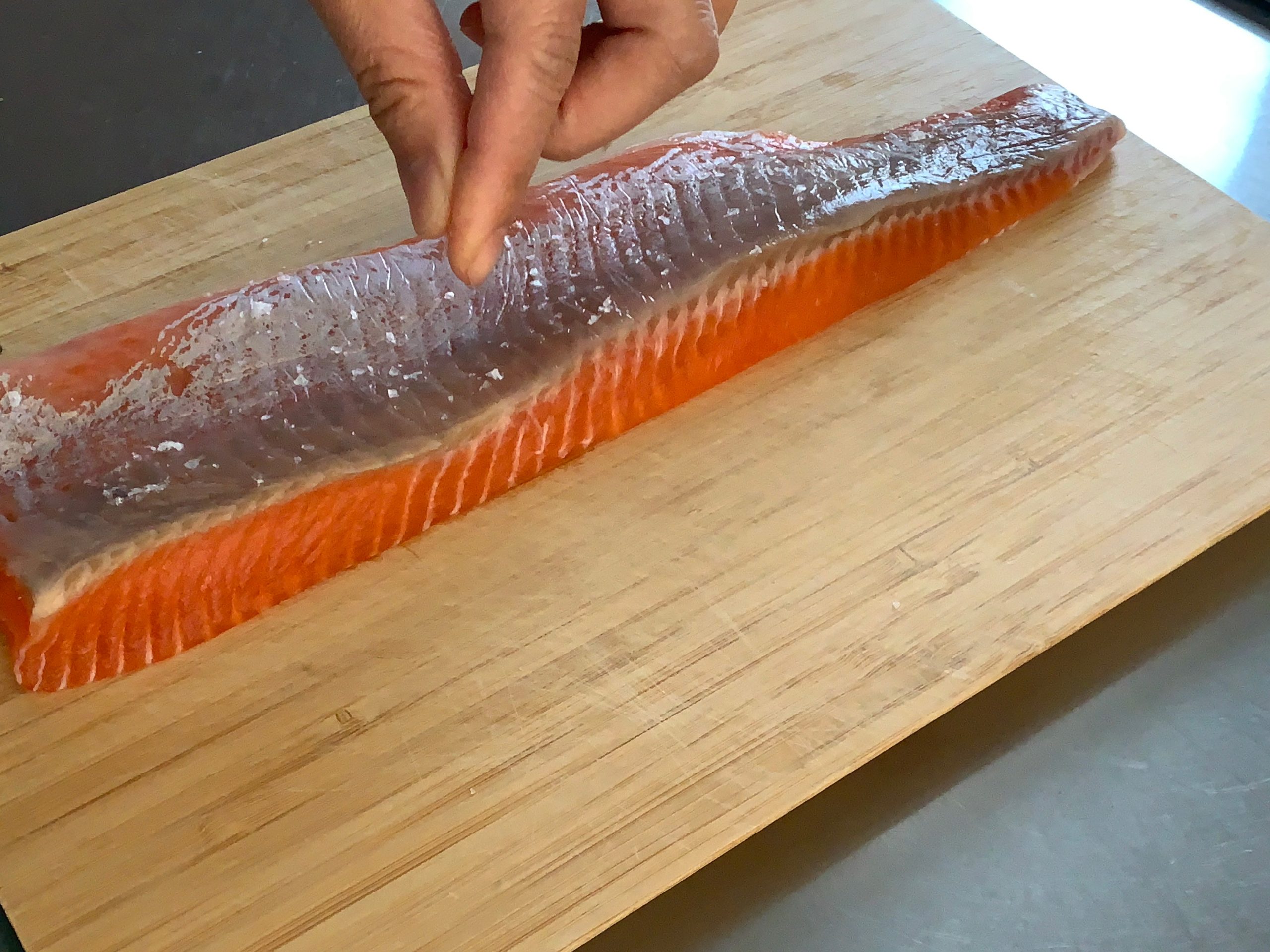 Cut the Shinshu salmon fillet into slices about 2 cm thick.