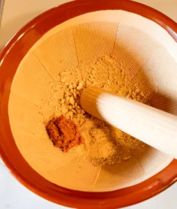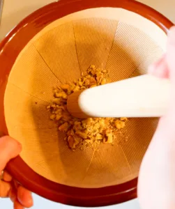 To prepare the walnuts, grind them in a mortar and pestle. You may choose to grind them into a fine powder or leave small pieces for added texture. I personally recommend leaving some small chunks, as they provide a deeper flavor and a more satisfying bite.