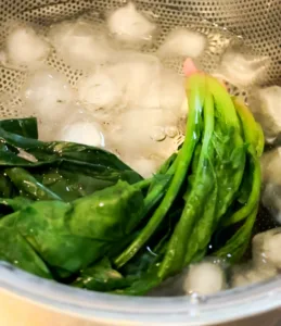 Bring a pot of water to a boil. Without cutting the spinach, place only the root ends into the boiling water for about 30 seconds. Then submerge the entire bunch and cook for another 30 seconds.